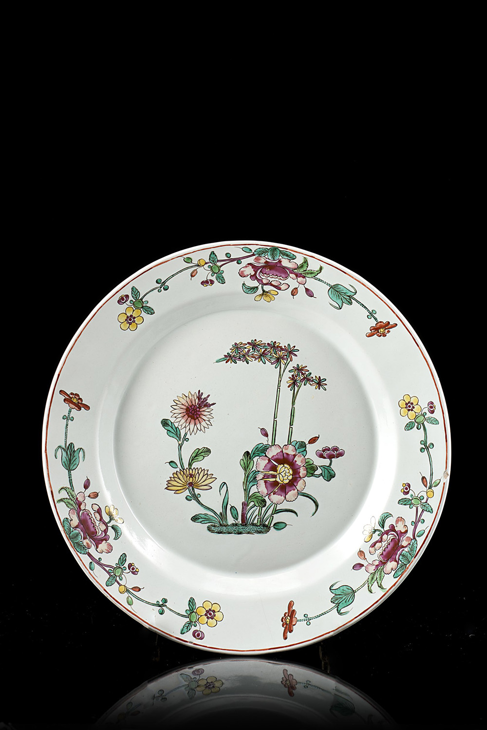 Manifattura di Pasquale Rubati, Milano, 1770/80 circa. Piatto tondo in maiolica a bordo liscio e profilato in rosso, tesa leggermente obliqua. Decorazione a piccolo fuoco su smalto bianco e fiori esotici (d. cm 24) (leggera sbeccatura) Per confronto si veda: Saul Levy, 'Maioliche Settecentesche Lombarde e Venete', tav. 111, Gorlich, 1964