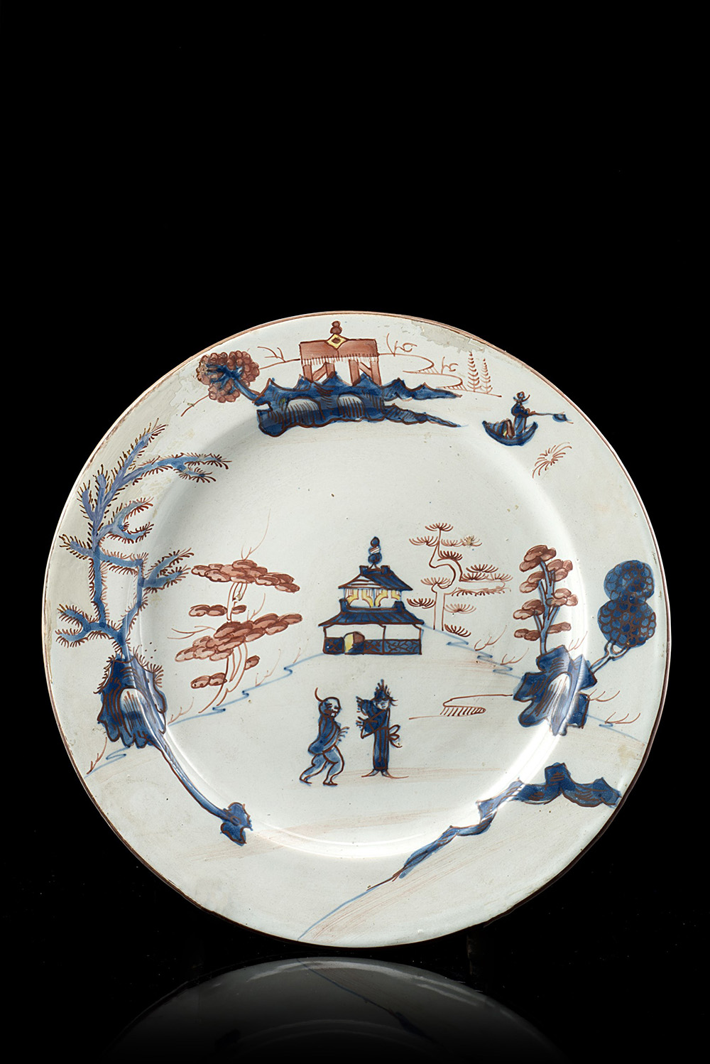 Manifattura di Felice Clerici e Pasquale Rubati, Milano, 1745/80. Piatto tondo in maiolica a bordo liscio e profilato in bruno con decorazione "alla pagoda" o "al carabiniere" (d. cm 23) (restauri)Questo tipo di decoro di derivazione orientale privilegia forme semplici che assomigliano di più alle porcellane cinesi smerciate in grande quantità sui mercati lombardi dalla Compagnia delle Indie.Il genere conobbe tale successo che la sua produzione si protrasse negli anni e fu prodotta sia dal Clerici che dal Rubati. Un intero servizio 'alla pagoda' è esposto nelle vetrine delle Civiche Raccolte d'Arte del Castello Sforzesco di Milano.Per confronti si veda: 'Musei e Gallerie di Milano, Museo d'Arti Applicate Ceramiche', Tomo II, Electa 2001, schede a cura di R. Ausenda
