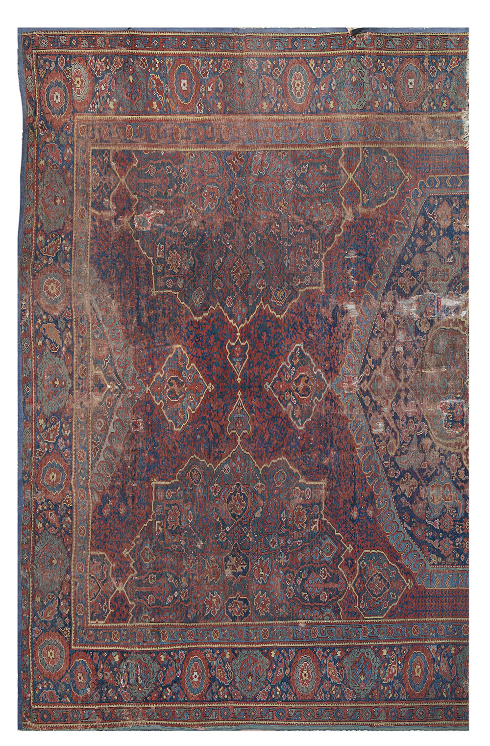 Large 17th century Medallion Ushak fragment. Little less than half of the entire carpet. Nice light blue ground bordure with floral tortoise pattern.(cm 517x380) (Loss and damages).