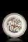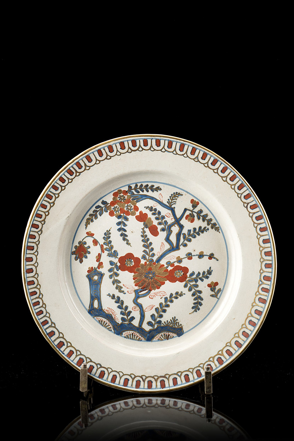 Manifattura di Pasquale Rubati, Milano, 1770/90. Piatto tondo a bordo liscio in maiolica. Il piatto fa parte della serie Imari con bordo a ovuli. La decorazione centrale, in rosso, blu e oro, è di derivazione orientale con radici, albero con andamento spezzato, crisantemo e fiori di pesco. Lo smalto è azzurrato (d. cm 23,2) (usure all'oro e puntinature allo smalto)Per confronto si veda: scheda n. 315 a cura di R. Ausenda in Musei e Gallerie di Milano - Museo d'Arti Applicate Ceramiche, Tomo II, Electa 2001