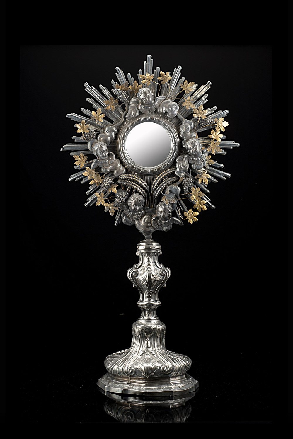 Ostensorio in argento con base bombata sagomata e fusto a balaustro di sezione ovale, decorati da volute e foglie alternate su fondo zigrinato; raggiera ornata da cherubini sbalzati entro nuvole, tralci d’uva e spighe di grano parzialmente dorati, e cornice ad ovoli. Manifattura ligure, probabilmente Genova, fine secolo XVIII/XIX (h. cm 74 ca.) (difetti) (Cfr. G. Roccatagliata, Argenti Genovesi, Genova 2002, p.43)