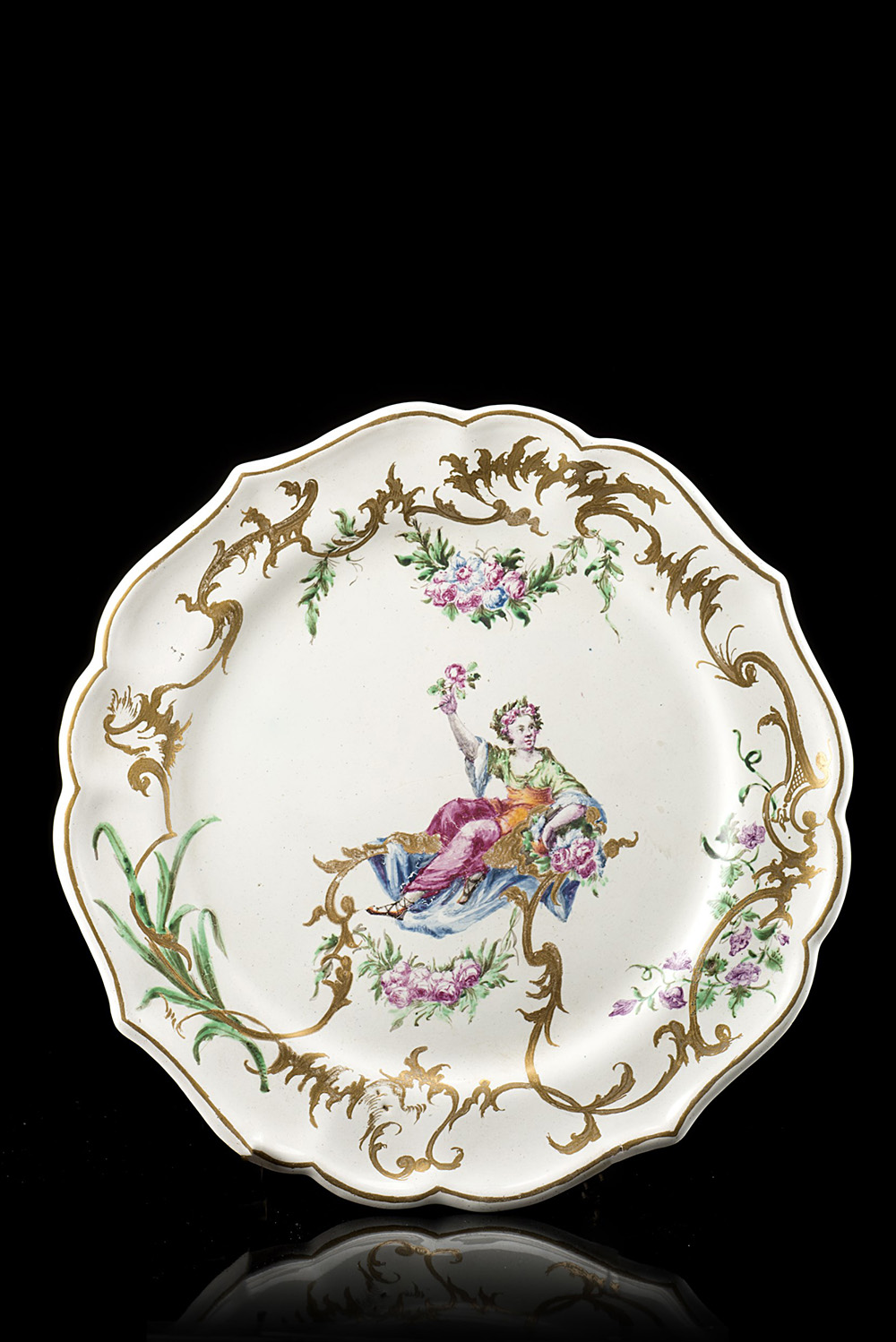 Manifattura di Felice Clerici, Milano 1760 circa. Piatto in maiolica di forma polilobata a quattro punte. Bordo a rocaille in oro e al centro figura femminile dell'abbondanza con cornucopia e fiori con colori a smalto. Il piatto è rivestito da smalto stannifero ricco e lucente. Sul retro marca FC Milano di Felice Clerici (d. cm 24)