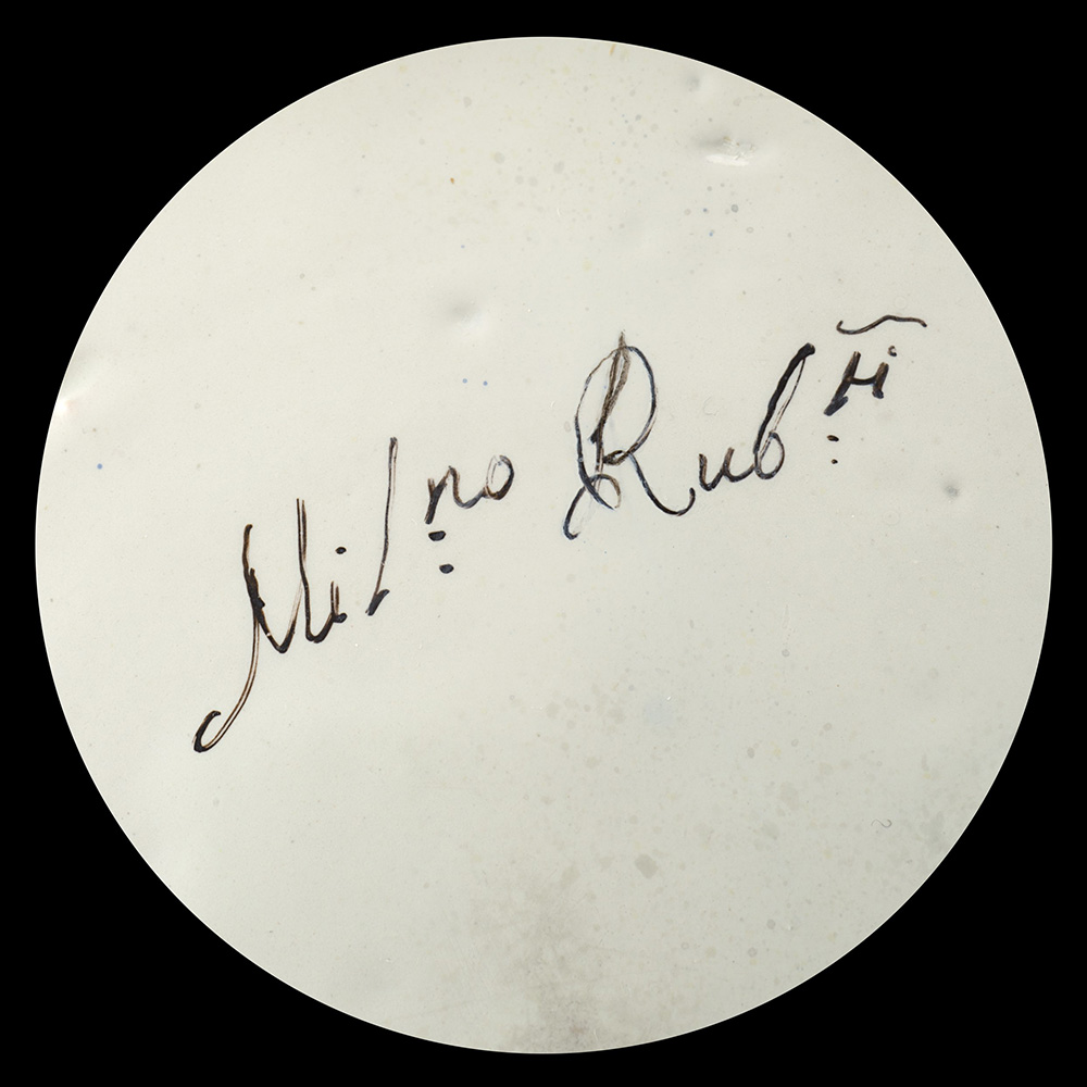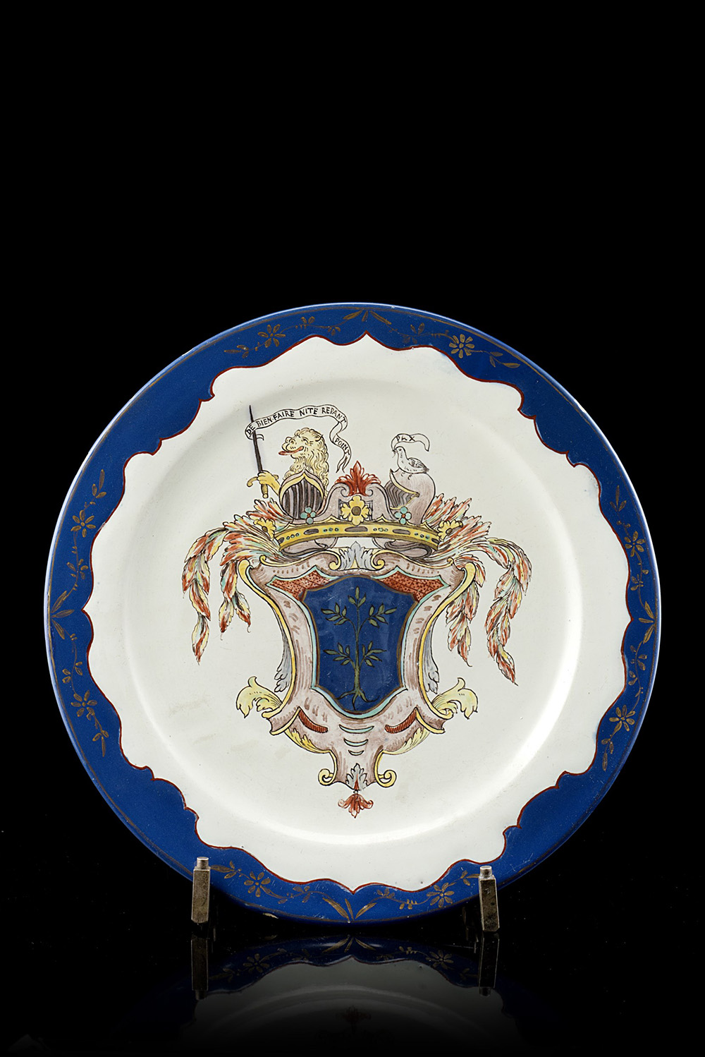 Manifattura di Pasquale Rubati, Milano 1770/80. Piatto tondo in maiolica con tesa a fondo blu con quattro rami in oro e riserva polilobata con stemma nobiliare policromo con il motto 'De bien faire nite repant point' appartenente al Marchese Uberto Olevano, Decurione e Patrizio di Pavia, Consigliere dello Stato di Milano (d. cm 23,5) (usure e lievi sbeccature)Sul retro reca la scritta Mil.no Rub.ti'. Si veda 'Maioliche di Lodi, Milano e Pavia', catalogo della mostra, a cura di G. Gregorietti, Museo Poldi Pezzoli, Milano 1964; 'Maioliche Settecentesche. Milano e altre fabbriche. Ceramiche della collezione Gianetti', a cura di R. Ausenda, n. 53, 1996
