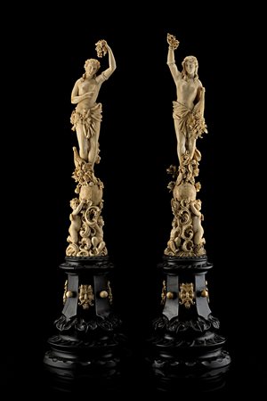 Arte nord europea, secolo XIX. Due statuette in avorio raffiguranti allegorie dell'Autunno e della Primavera scolpite a figure femminili, putti, volute, fiori e frutti. Poggianti su basi ebanizzate decorate con mascheroni e sfere in avorio (h. cm 39) (lievi difetti)