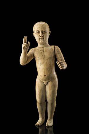 Arte europea, inizio secolo XVIII "Bambino benedicente" scultura in avorio (h. cm 36) (difetti)