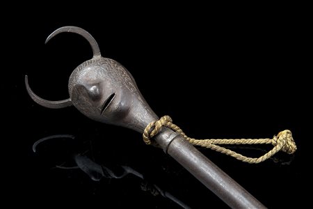 Mazza con rappresentazione del demonio. Persia, sec. XIX. Asta in ferro e mazza in ferro ageminato in argento (cm 73) (difetti)