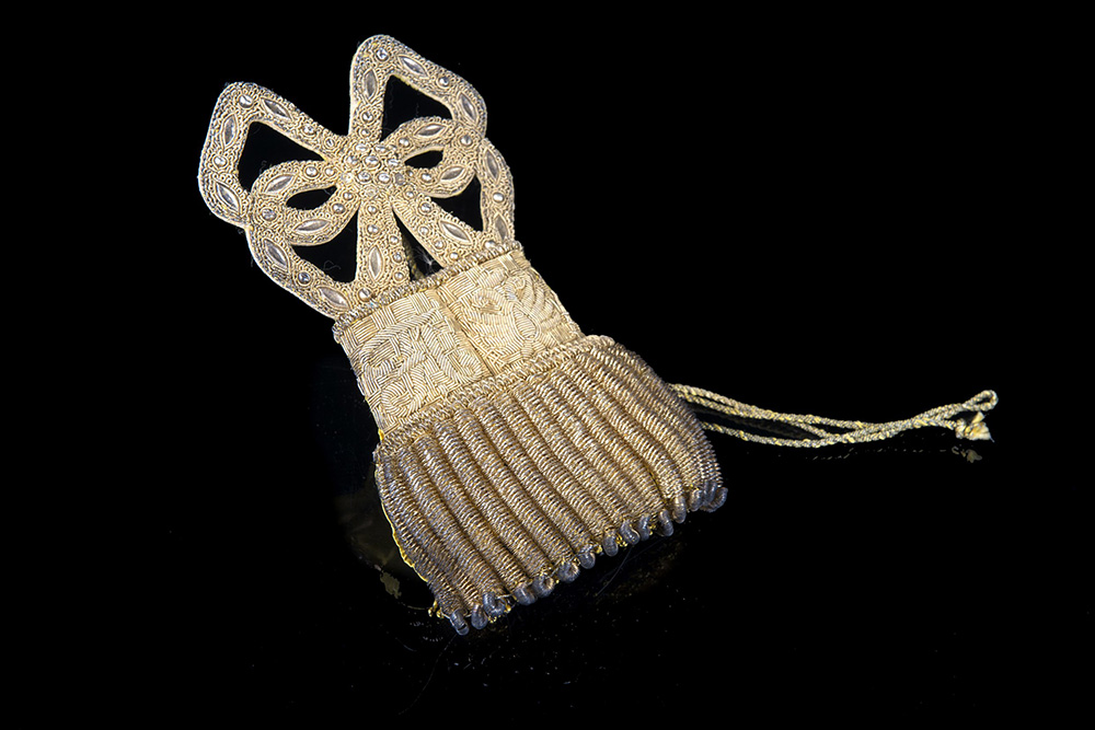 Broderie in filo d'argento dorato con grande nodo a fiocco, con monogramma di Ferdinando I, Imperatore d'Austria, 1830 circa (cm 15) probabile insegna di dama di corte (difetti)