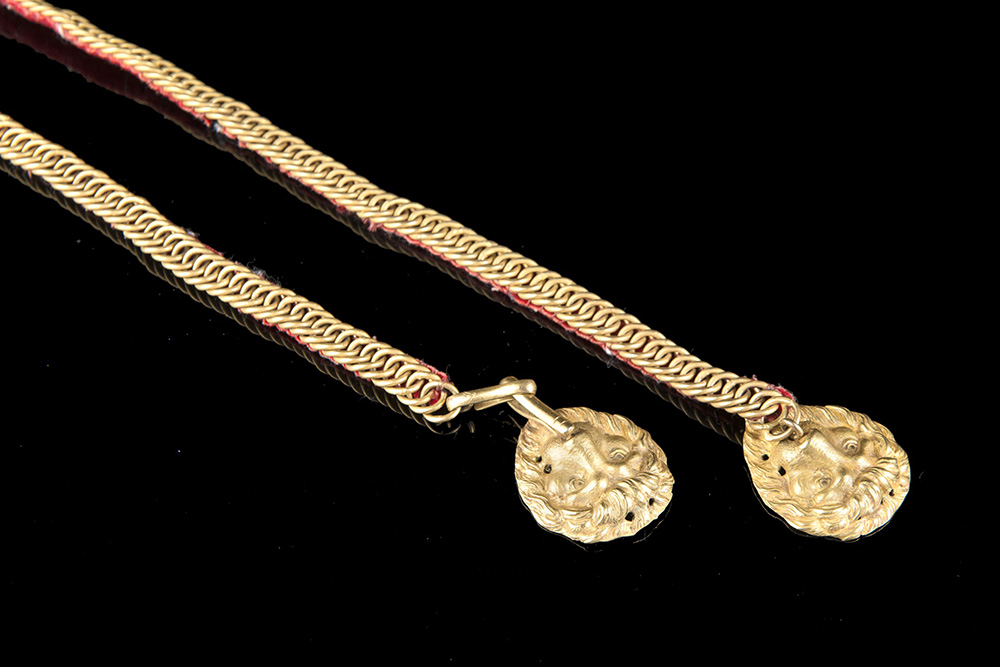 Mascheroni di teste leonine in metallo dorato al mercurio con catenelle dorate e sottopannate di rosso. Parti di uno chacot di cavalleria austriaca, secondo quarto sec. XIX (l. cm 77) (difetti)
