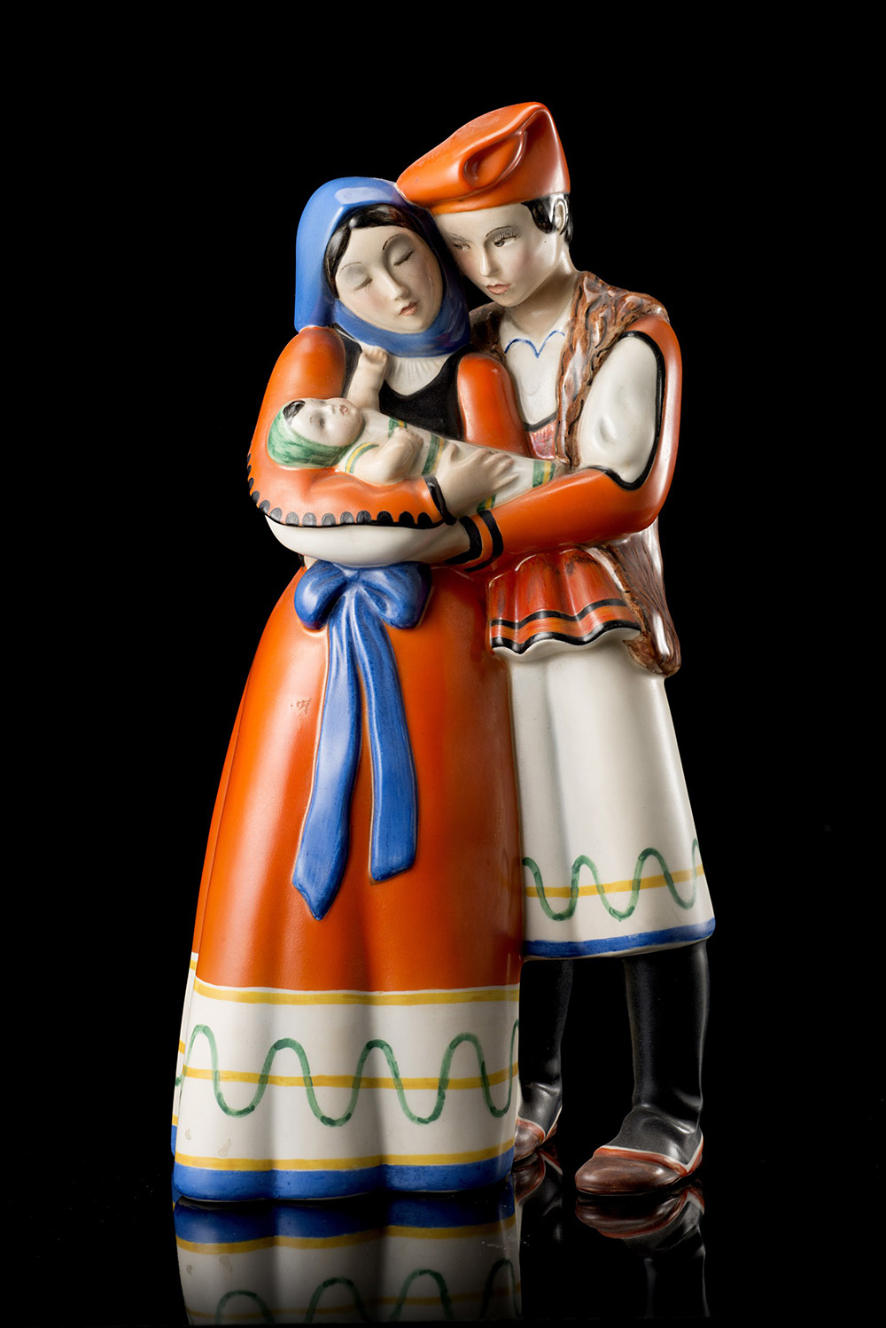 Polychrome opaque cast ceramic. Turin, 1930s. Signed under the base "Lenci MADE IN ITALY TORINO", numbered "1162" and with the initials "CB" of the decorator and the factory paper label. (h 27.5 cm.) (slight defects)