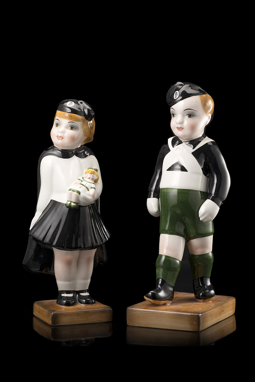 Two Antonio Zen style polychrome underglaze cast ceramic sculptures. Italy, second half 20th century. Signe in black under the base "A.Z.". (h cm 37.5 e h cm 34)