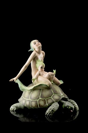 Polychrome underglaze cast ceramic. Manufacture of Lenci, Turin, 1933. Signed under the base "Lenci MADE IN ITALY TORINO X-XII" and with the graphic symbol of the decorator. (31.5x31.5x22 cm.) (slight defects)