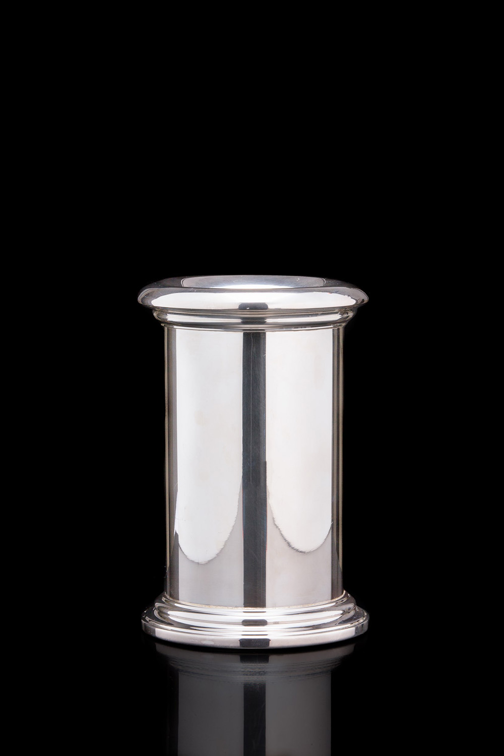 Secchiello rinfrescatoio per bottiglie in argento (925/1000) con corpo a rocchetto e superficie liscia. Firenze, secolo XX. Argentiere Pampaloni (h. cm 21 ca.) (g lordi 1200 ca., comprensivi del materiale isolante) (lievi difetti)