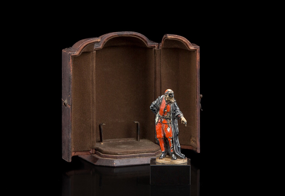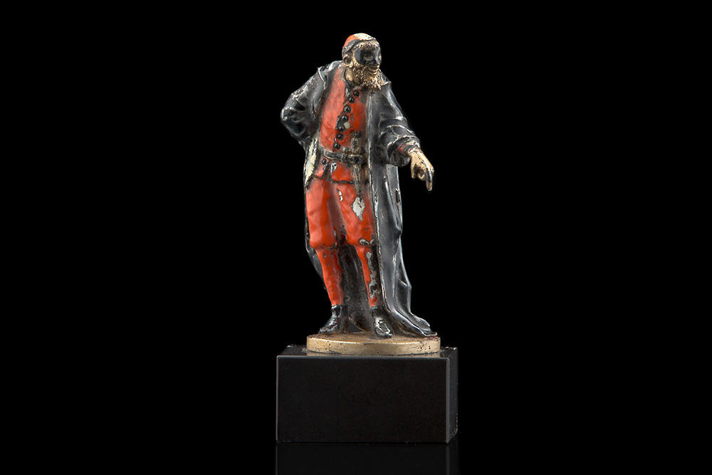 A sculpture in enamelled silver depicting 'Pantalone'. Milan, early 20th century, signed A. Ravasco. In original case (h. cm 9,3) (defects)