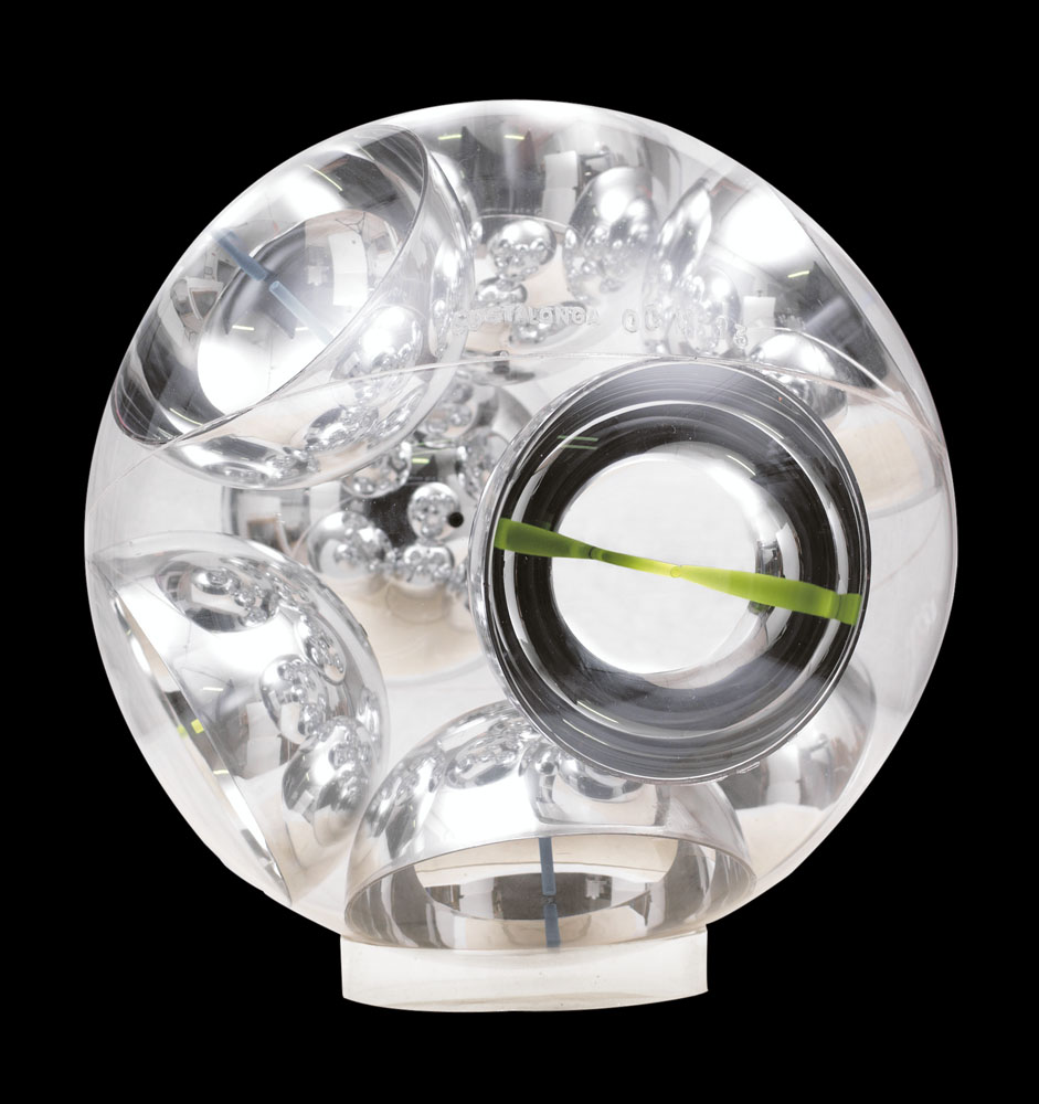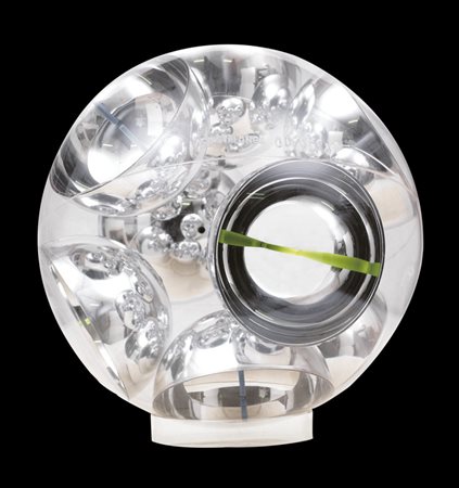 FRANCO COSTALONGA Venezia 1933 OCM 13 sfera assemblaggio di materie plastiche (8 semisfere entro sfera in plexiglass) diametro cm. 30, firma e titolo incisi sul plexiglass, dichiarazione d'autenticità dell'artista e timbro della Anti: galleria d'arte (Mestre-VE) su foto.