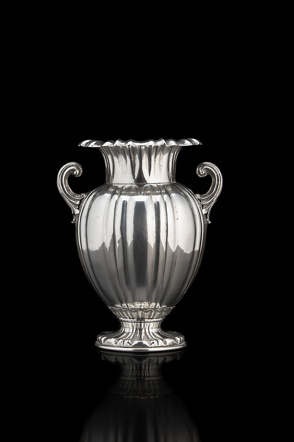 Vaso in argento con corpo ad anfora sagomato a baccellature radiali, con...