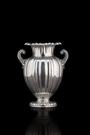 Vaso in argento con corpo ad anfora sagomato a baccellature radiali, con prese verticali a voluta. Milano, metà secolo XX. Argentiere Genazzi (h. 25,5 ca.) (g 1090 ca.) (lievi difetti)