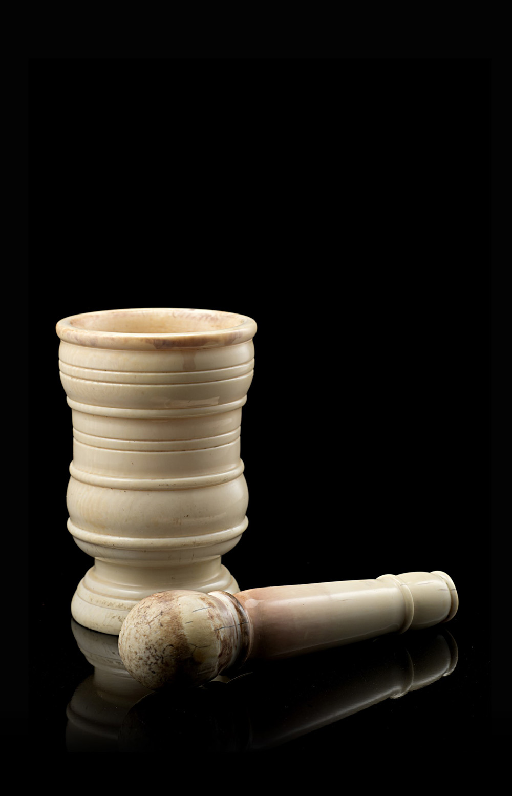 Piccolo mortaio in avorio tornito con pestello a torniture sferiche, inizio del secolo XIX (h. mortaio cm 10) (lievi difetti)