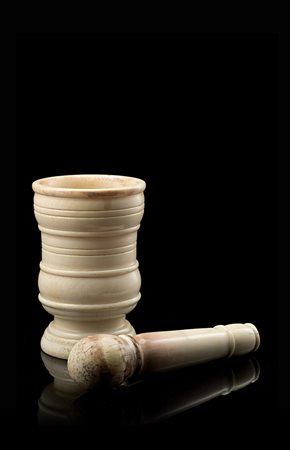 Piccolo mortaio in avorio tornito con pestello a torniture sferiche, inizio...