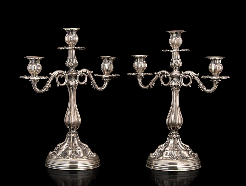 Coppia di candelabri in argento a tre fiamme con fusto a balaustro, piede polilobato su plinto circolare e bobeches baccellati, con raccordi a bocciolo e bracci a doppia voluta fogliata. Palermo, metà secolo XX (h. cm 34,5 ca.) (g tot. lordi 1140 ca.) difetti