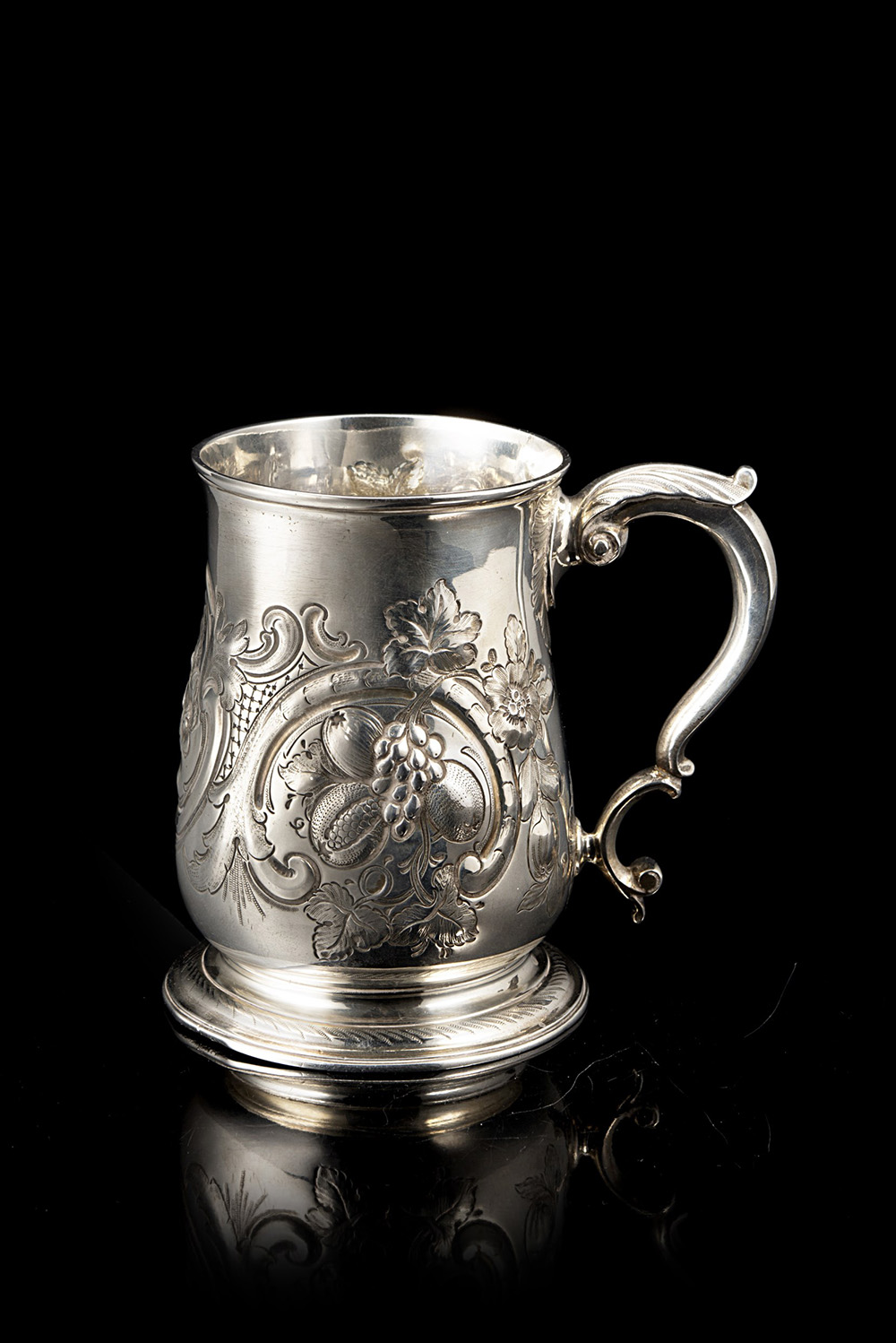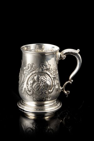Boccale in argento, con corpo a balaustro e superficie sbalzata a volute e motivi floreali; manico a doppia voluta. Londra, 1755 (h. cm 12) (g 340 ca.) (lievi difetti)