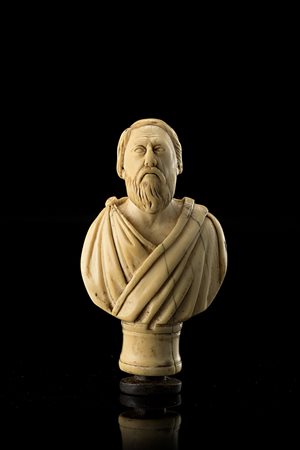 Sigillo in avorio scolpito con figura in vesti romane a tutto tondo (h. cm 7,5) Secolo XIX (difetti)