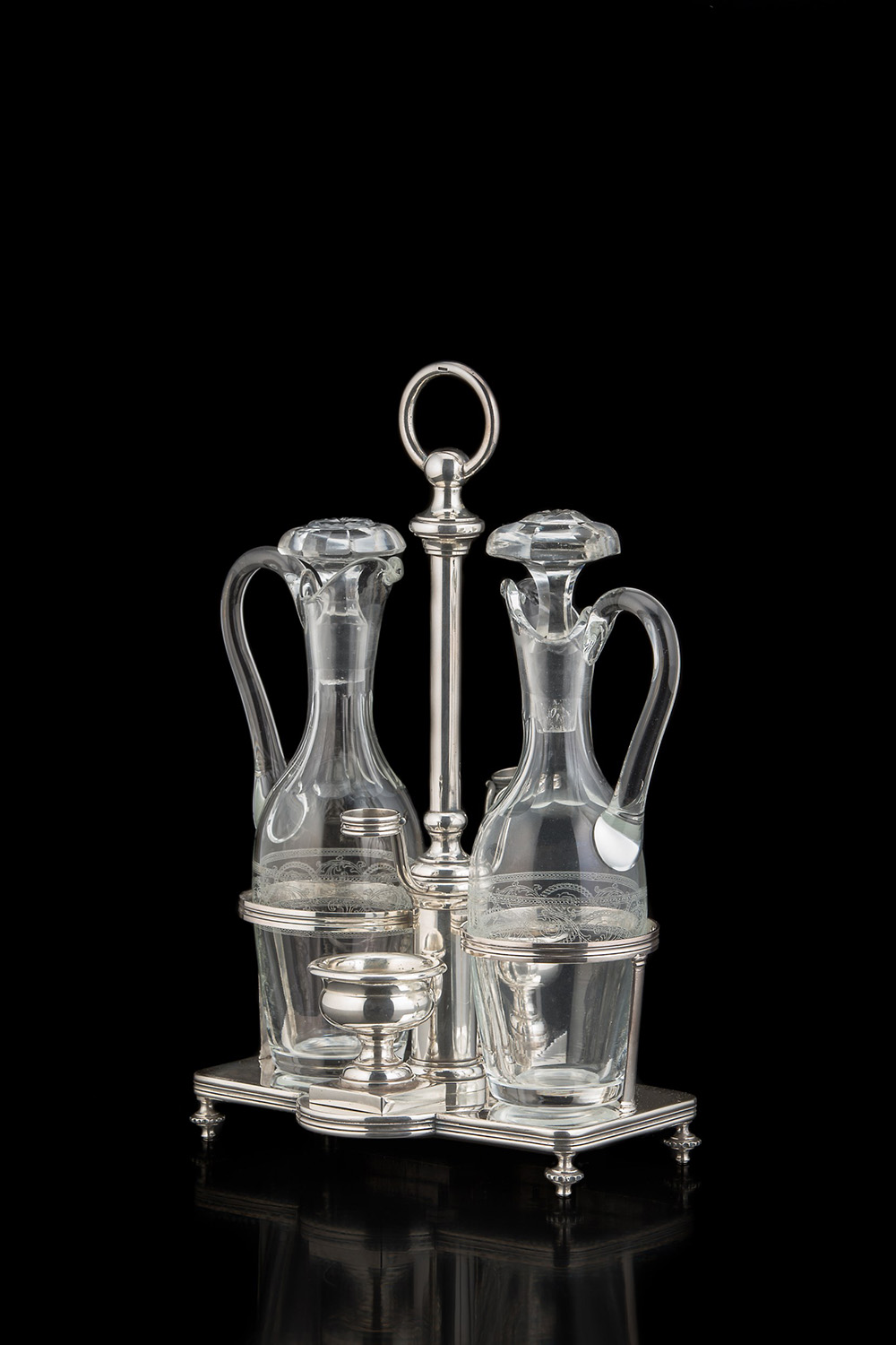 Oliera in argento con base di forma rettangolare sagomata, cestini porta ampolle e saliere a cratere, decorata da profili modanati; presa centrale a colonna con terminale ad anello. Italia, fine secolo XIX–inizi XX (h. max cm 30,5 ca.) (g 830 ca.) (lievi difetti)
