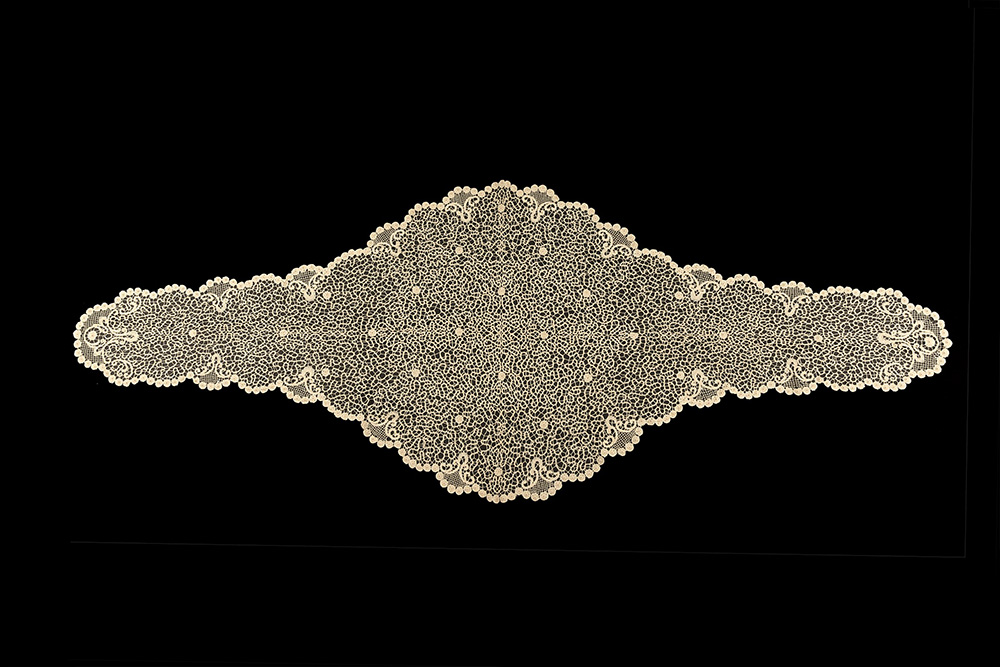 Realizzato in pizzo di Cantù in cotone color avorio perlato di titolo molto fine, eseguito al tombolo con fuselli . Decorato con motivo a serpentina con fiorellini sparsi e bordo a festoni(l. 124 cm) ((ottimo stato di conservazione))