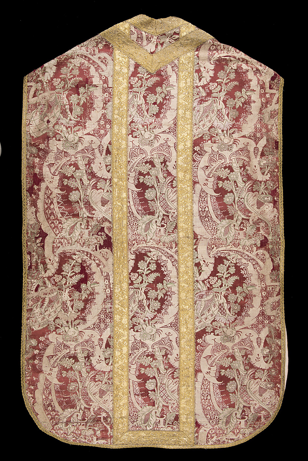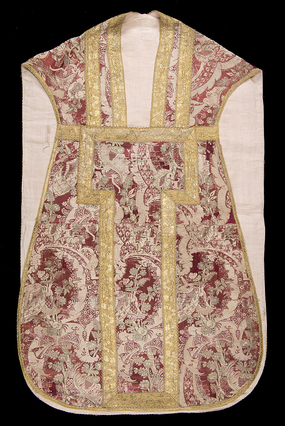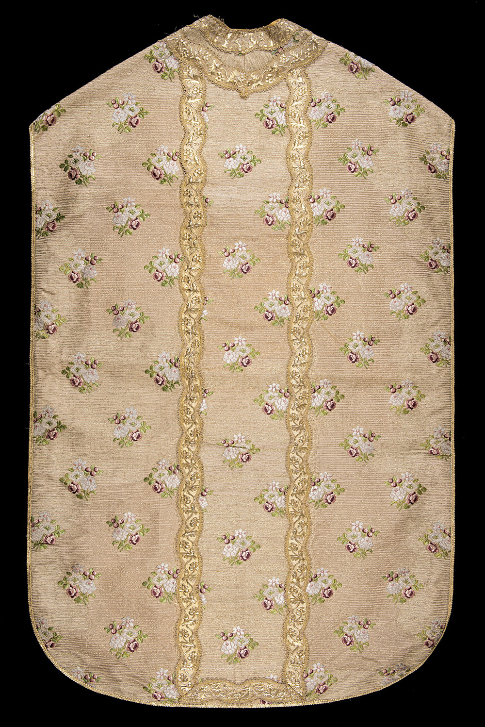 Two 18th century chasuble tailored one with dark pink and cream silk Bizarre lampas , the other with silk and cotton textile covered with chain stitch and with small flowers bouquet pattern. With their stoles. France. (minor damages)