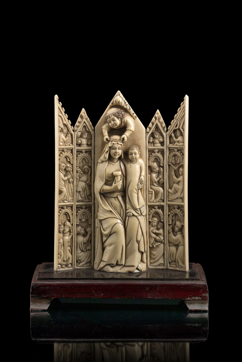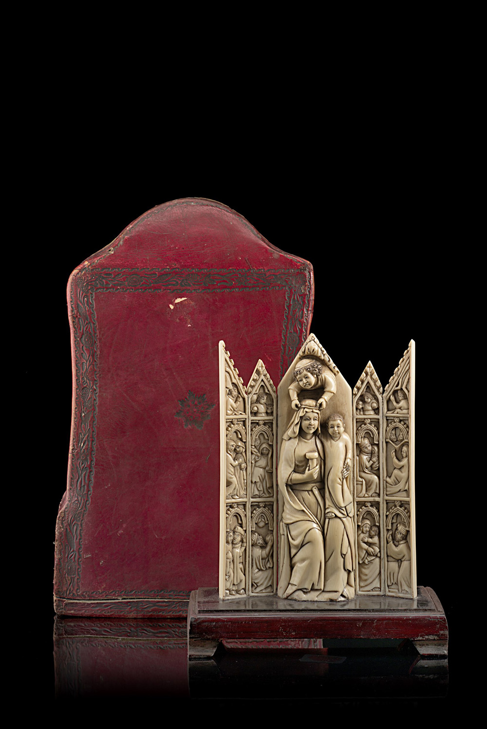 19th-century South American art. An ivory triptych depicting the Virgin and Child and scenes from the life of the Virgin (h. cm 13,5) base of a later date. With case (defects)