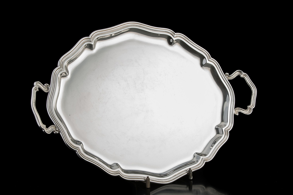 Vassoio in argento a due manici, di forma ovale sagomata con superficie liscia e bordura modanata. Padova, metà secolo XX (lungh. cm 55 ca.) (g 1230 ca.) (lievi difetti)