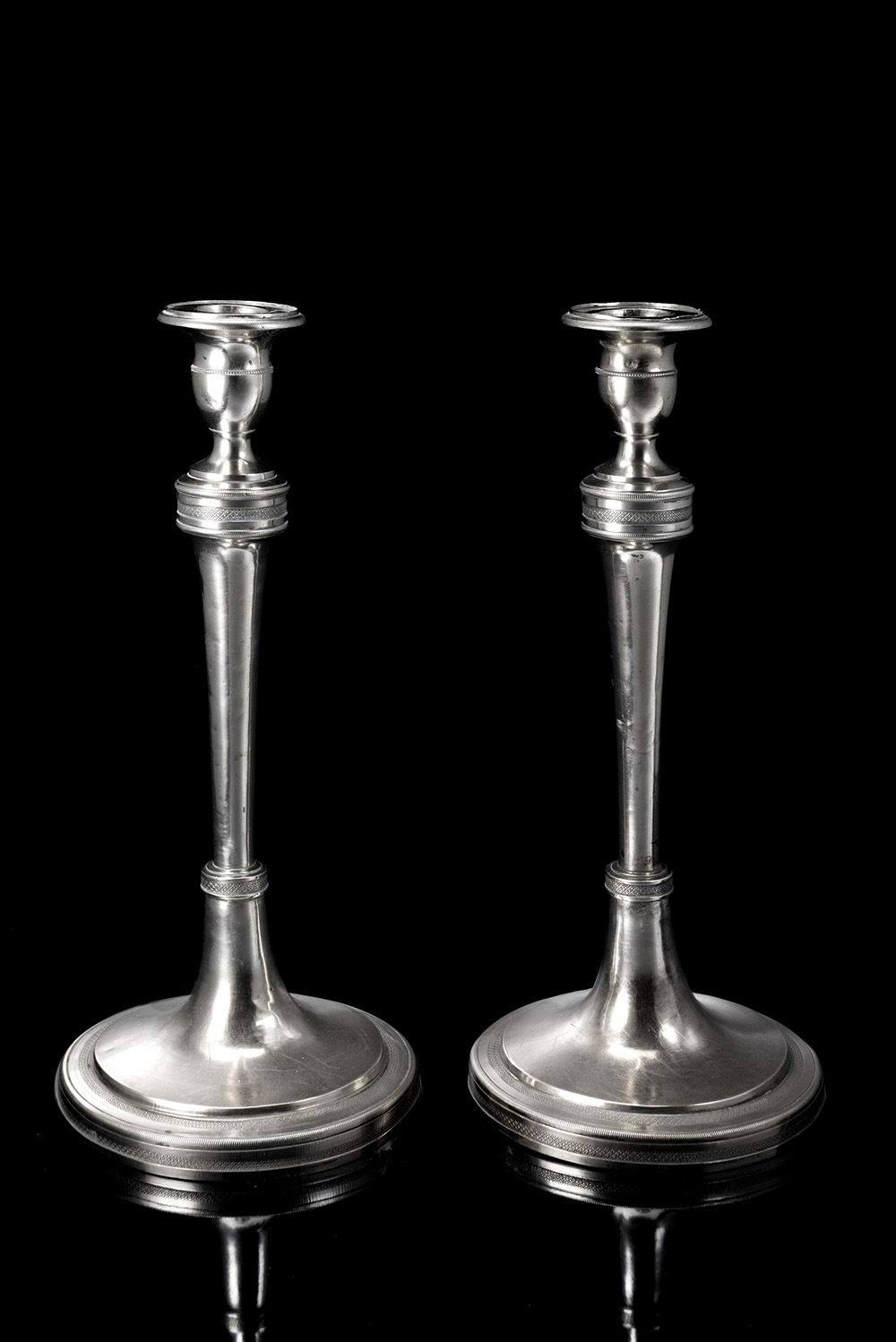 Coppia di candelieri in argento di sezione circolare con fusto rastremato e superficie liscia decorata da cintura godronata. Regno delle Due Sicilie, Napoli 1824/1832 (h. cm 25,5) (g 530 ca.) (difetti)