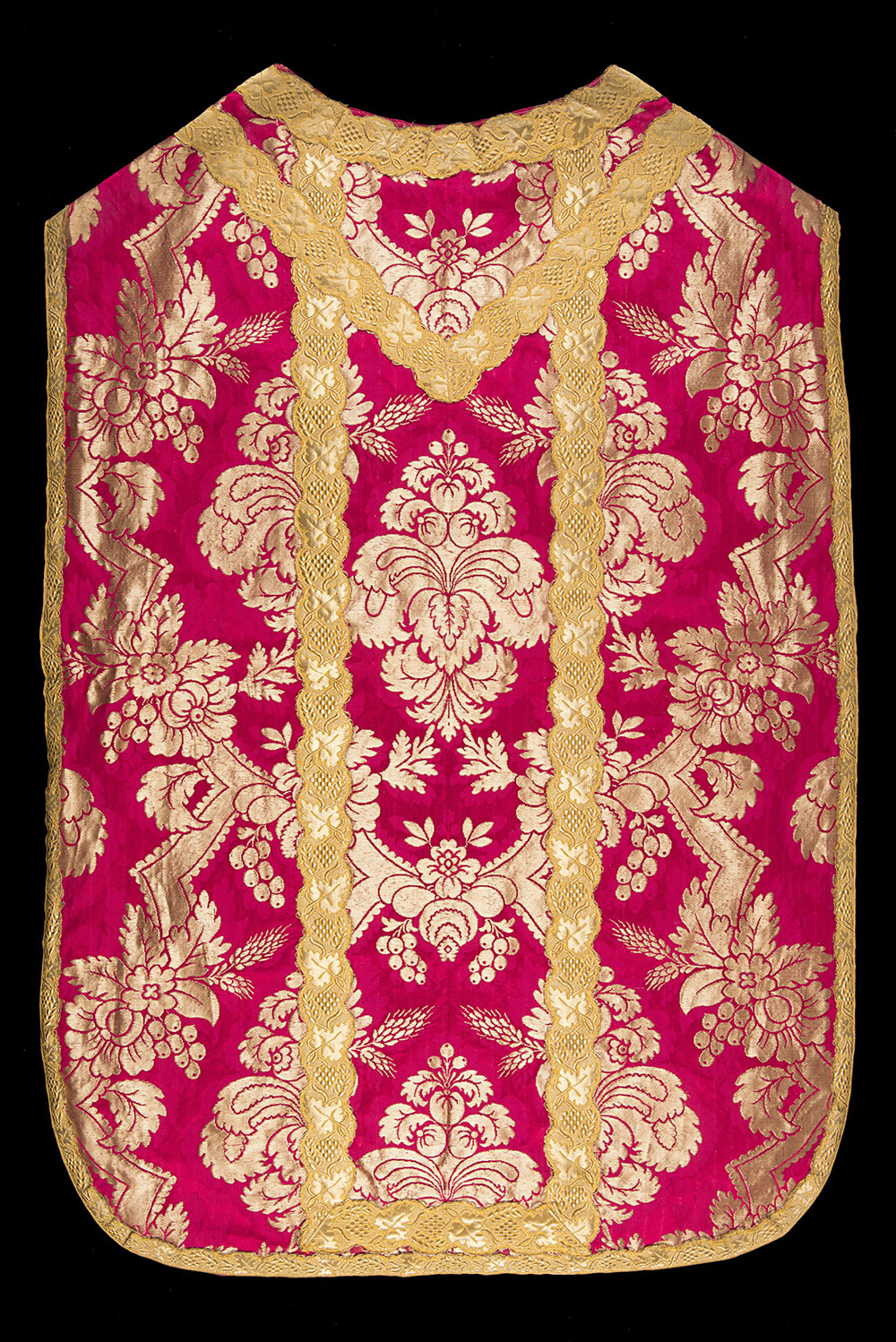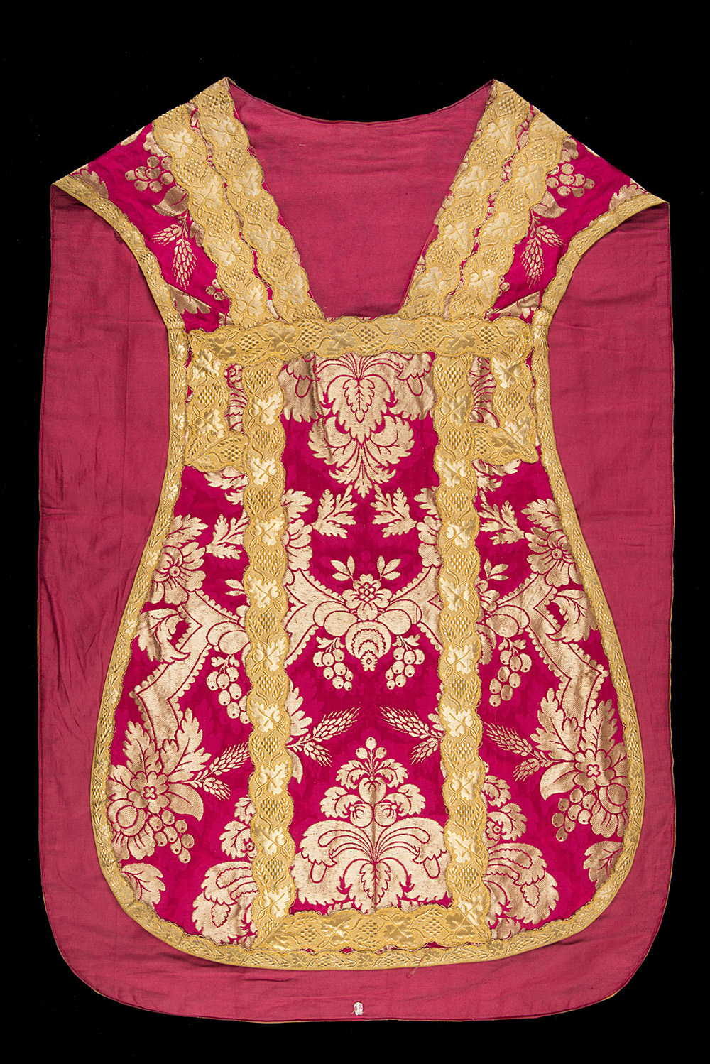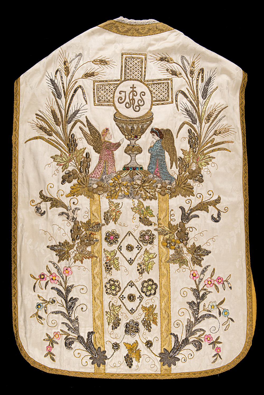Due pianete, una a fondo rosso cremisi ed una a fondo blu scuro, confezionate con lampassi in seta e broccature in metallo dorato ed argentato, la terza con fondo di seta bianca, ricamata con Angeli oranti, Ostensorio e Cristogramma, ornati da rami fioriti con broccature in argento e ricami a rilievo profilati da un cordoncino. (difetti e restauri)
