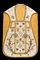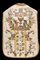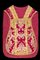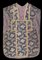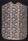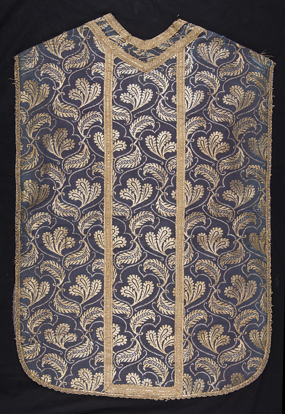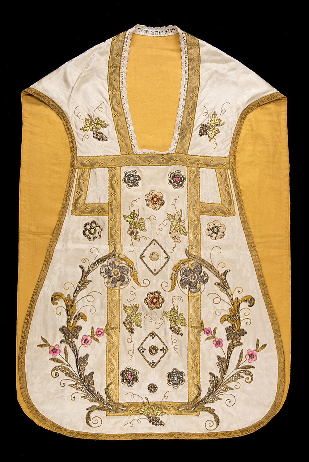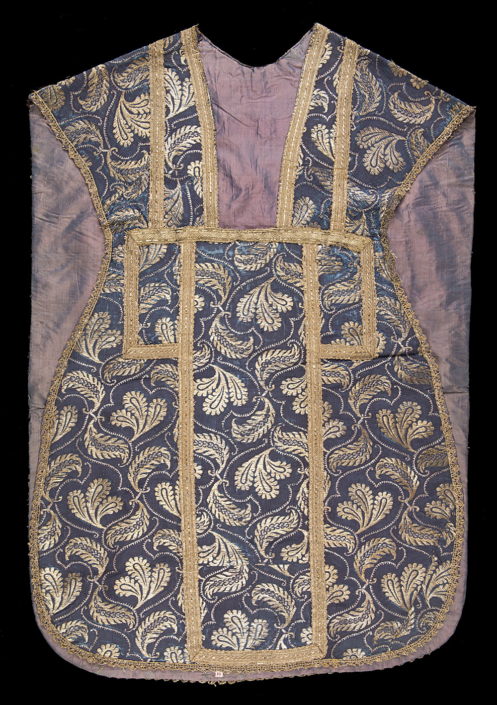Due pianete, una a fondo rosso cremisi ed una a fondo blu scuro, confezionate con lampassi in seta e broccature in metallo dorato ed argentato, la terza con fondo di seta bianca, ricamata con Angeli oranti, Ostensorio e Cristogramma, ornati da rami fioriti con broccature in argento e ricami a rilievo profilati da un cordoncino. (difetti e restauri)