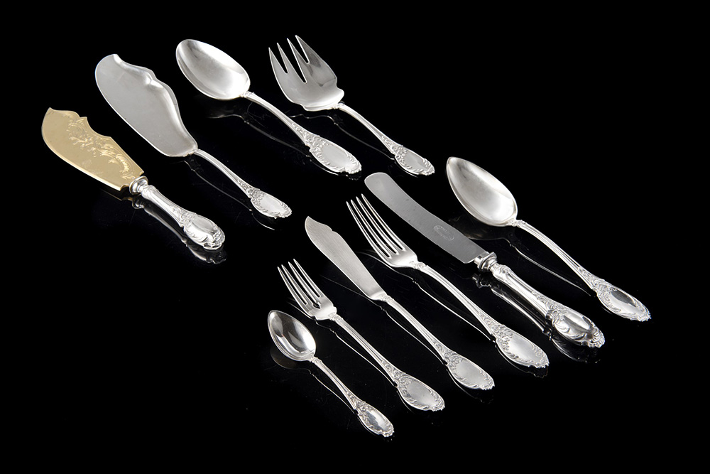 Servizio di posate in argento composto da dieci cucchiai, venti forchette e venti coltelli tavola, sei forchette frutta, dodici forchette e dodici coltelli pesce, otto cucchiaini da thè, quattro posate da portata. Germania, inizio secolo XX (g 4470 ca.) (lievi difetti)