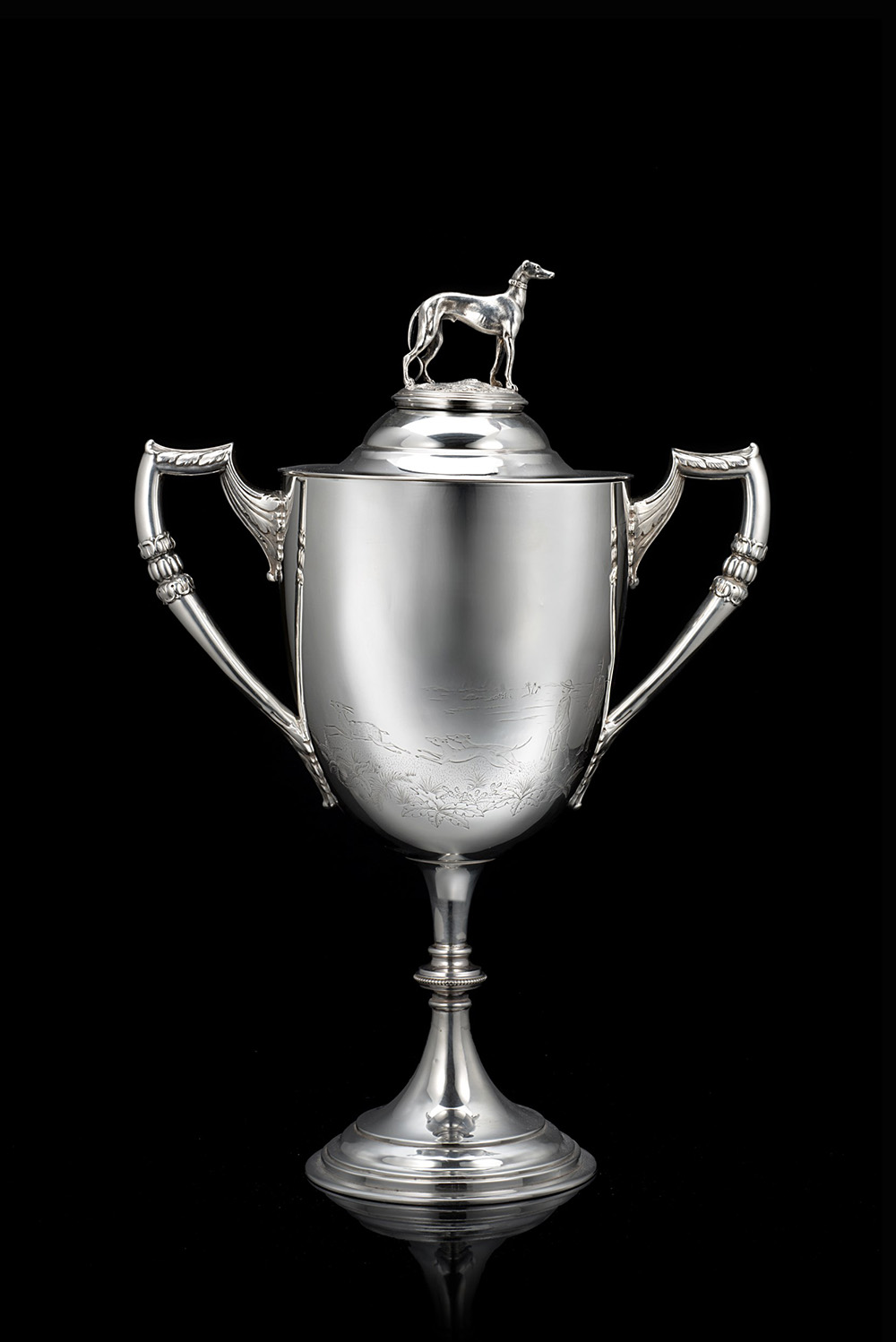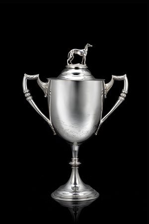 Coppa biansata, con coperchio, in argento, decorata con scene di caccia incise; prese ad ansa squadrata e pomolo a tutto tondo in figura di levriero. Birmingham, 1888, argentiere Elkinton & Co (Frederick Elkington) (h. cm 42,5 ca.) (g 920 ca.) (lievi difetti)