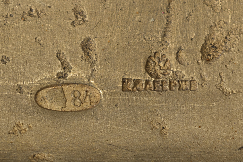 Portasigarette in argento di forma rettangolare con superficie a texture ceroso-liquida; interno in vermeil e chiusura con cabochon in pietra dura. Mosca, 1908-27, argentiere Karl Fabergé; numero di inventario graffito: 35590 (cm 9,2x7 ca.) (g 185 ca.) (lievi difetti)