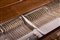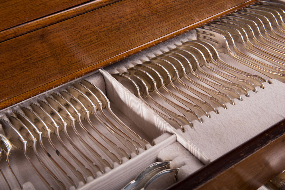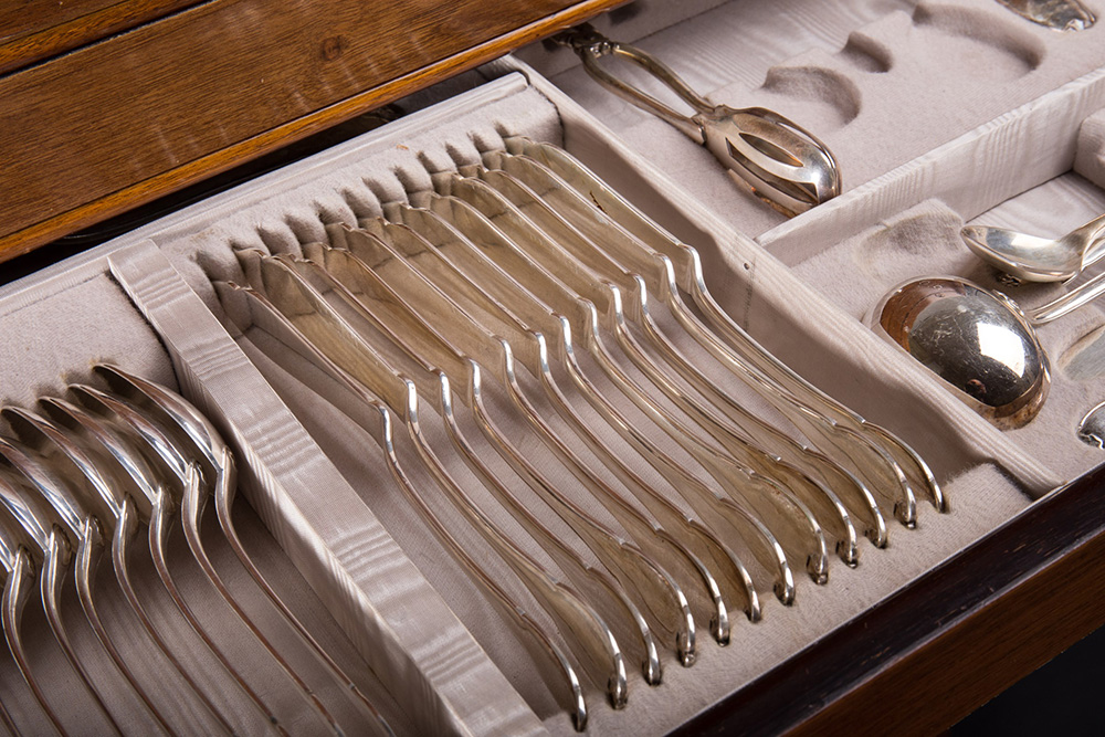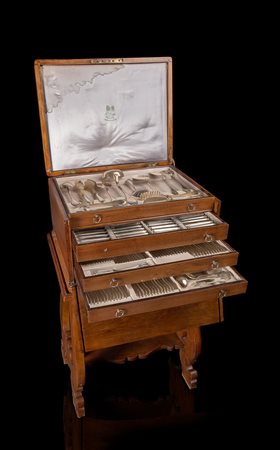 Servizio di posate in argento composto da ventiquattro forchette, dodici cucchiai e ventiquattro coltelli, dodici forchette, dodici cucchiai e dodici coltelli da frutta, dodici forchette e dodici coltelli da pesce, dodici coltelli da pesce più piccoli, dodici forchette da dolce, dodici cucchiai da gelato, dodici da caffè e dodici da tè unito a ventuno posate a servire in argento e una in metallo argentato. In custodia con tavolino in legno. Ricci & Cesa. Alessandria, metà secolo XX (g tot. 10000 ca.)