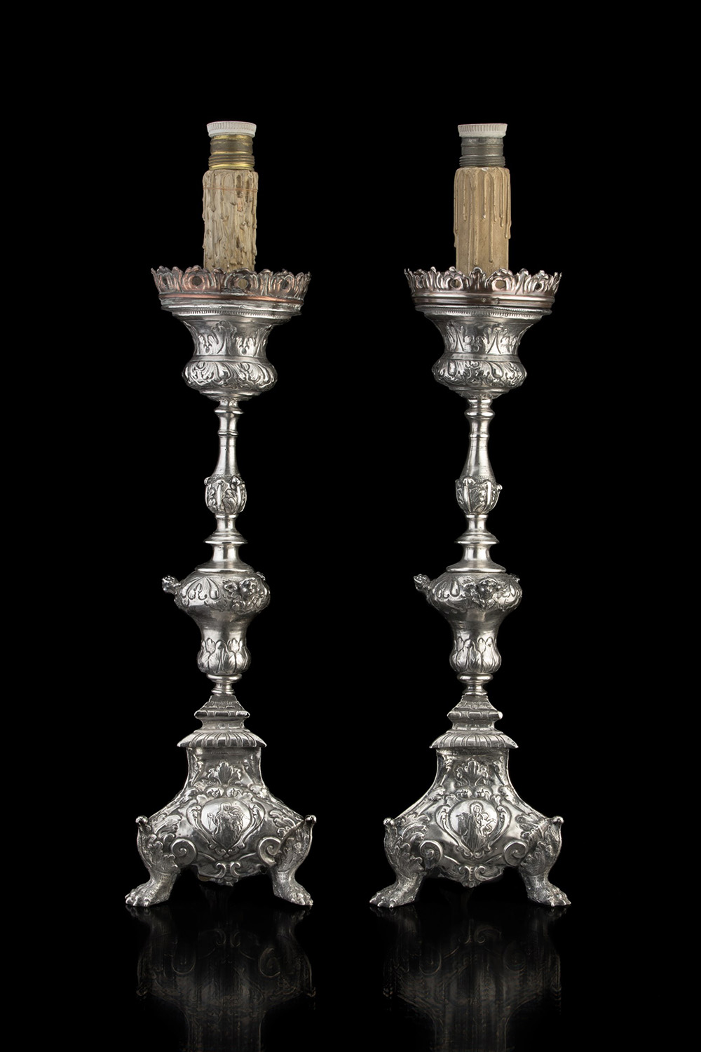 Coppia di torciere in argento con fusto a balaustro su base triangolare, decorate con foglie cesellate su fondo puntinato, applicazioni di cherubini a tutto tondo, figura di Madonna con Bambino ed iniziali "L P", entro medaglioni. Montati a lampada elettrica. Zecca di Venezia, Sazador Zuan Piero Grappiglia, secolo XVIII (h. tot. cm 63 ca.) (g netti 1700 ca.) (difetti)