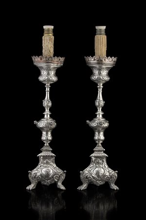 A pair of silver torcheres. Mounted with electric lamp. Mint of Venice, Sazador Zuan Piero Grappiglia, 18th century (h. total cm 63) (g 1700 ca.) (defects)