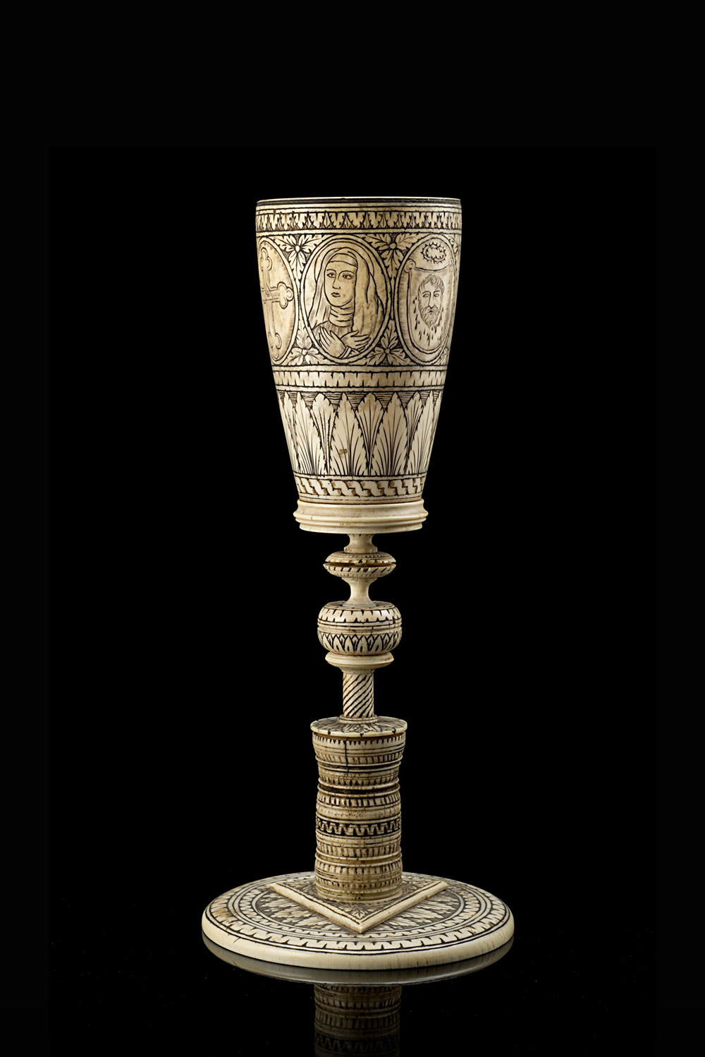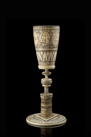 Antico calice probabilmente palestinese in avorio inciso a figure religiose,...