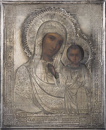 Icona raffigurante Madonna di Kazan con riza in argento dorato. Russia, 1893 (cm 27x22,5 ca.) (difetti)