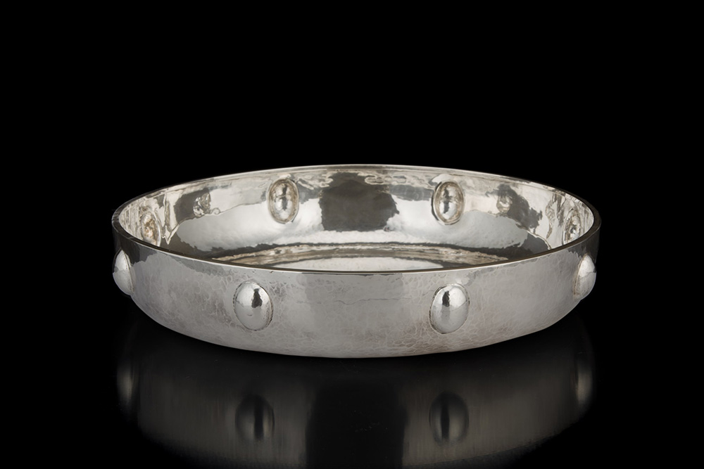 Ciotola in argento di forma circolare con sponda decorata a semisfere sbalzate e superficie martelé. Firenze, secolo XX, Brandimarte (d. cm 32 ca.) (g 1040 ca.) (lievi difetti)