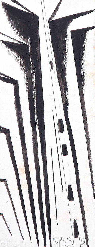 ROBERTO MARCELLO BALDESSARI Innsbruck (Austria) 1894 - Rovereto (Tn) 1963 Dinamismo + strada 3°, 1919 china su carta cm. 27,5x10,4; sigla e anno in basso a destra, l'opera fa parte di una cartelletta di 27 disegni numerati (il presente è numerato 15 al retro), ceduto a F. Paspis di Venezia nel 1934, opera registrata presso l'Archivio Unico per il Catalogo delle Opere Futuriste di Roberto Marcello Baldessari come da attestato d'archivio allegato.