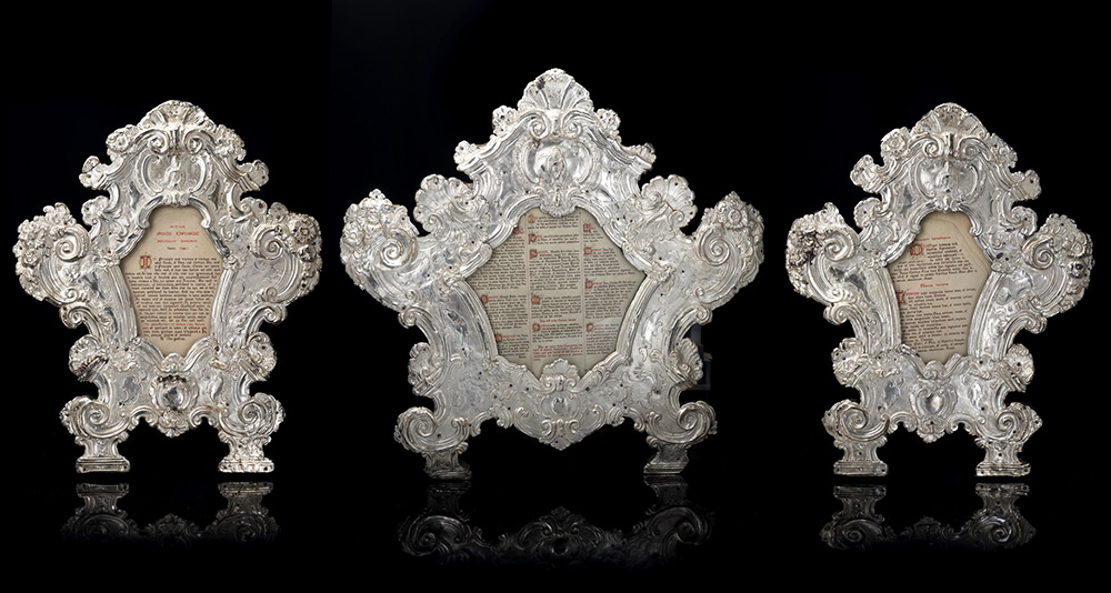 Trittico di cartegloria in argento, sbalzate a volute, motivi floreali, frange zigrinate e conchiglie, con figura di santo entro cartiglio e datario 1774 cesellati; schienale in legno. Repubblica di Venezia, seconda metà secolo XVIII, assaggiatore Zuan Piero Grappiglia. Argentiere Z F. (cm 68x68 ca.; 42x51 ca.) (difetti)
