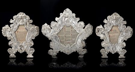 Three chased silver cartaglorias. Republic of Venice, second half of the 18th century, Zuan Piero Grappiglia. Argentiere Z F. (cm 68x68 ca., 42x51 ca.) (defects)
