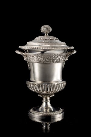 Coppa in argento con coperchio: corpo a cratere decorato con fasce di tralci d'uva, baccellate e godronate; prese in figura di serpenti affrontati con attacco a mascherone e cimatura a bocciolo. Iscrizione: The Earl of Plymouth as a testimony of Friendship to the Revd Thomas Blackall. Londra, 1810, W. Storey & William Elliott (h. cm 26,5) (g 1400 ca.) (lievi difetti)