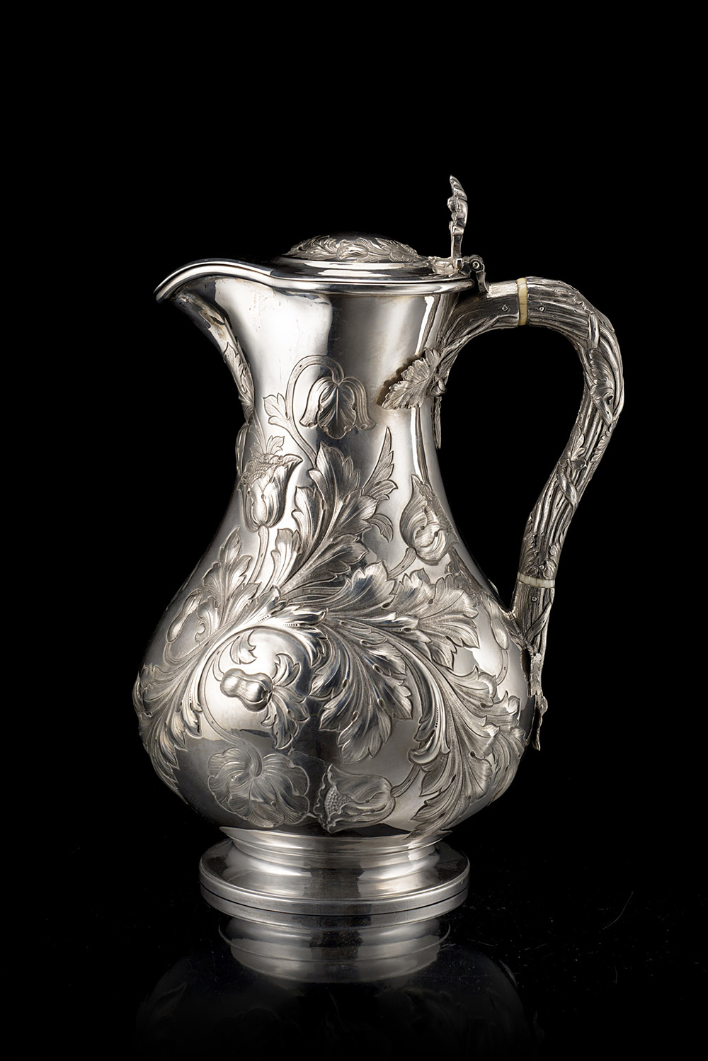 Versatoio in argento con coperchio con corpo a balaustro decorato da fronde fiorite e frutti, manico ad ansa in figura di fascio di rami intrecciati a tutto tondo con attacchi fogliati. Incisione con motto 'Gang Warily' (famiglia Drummond ?) Edimburgo, 1858 (h. cm 28) (g 1020 ca.) (lievi difetti)