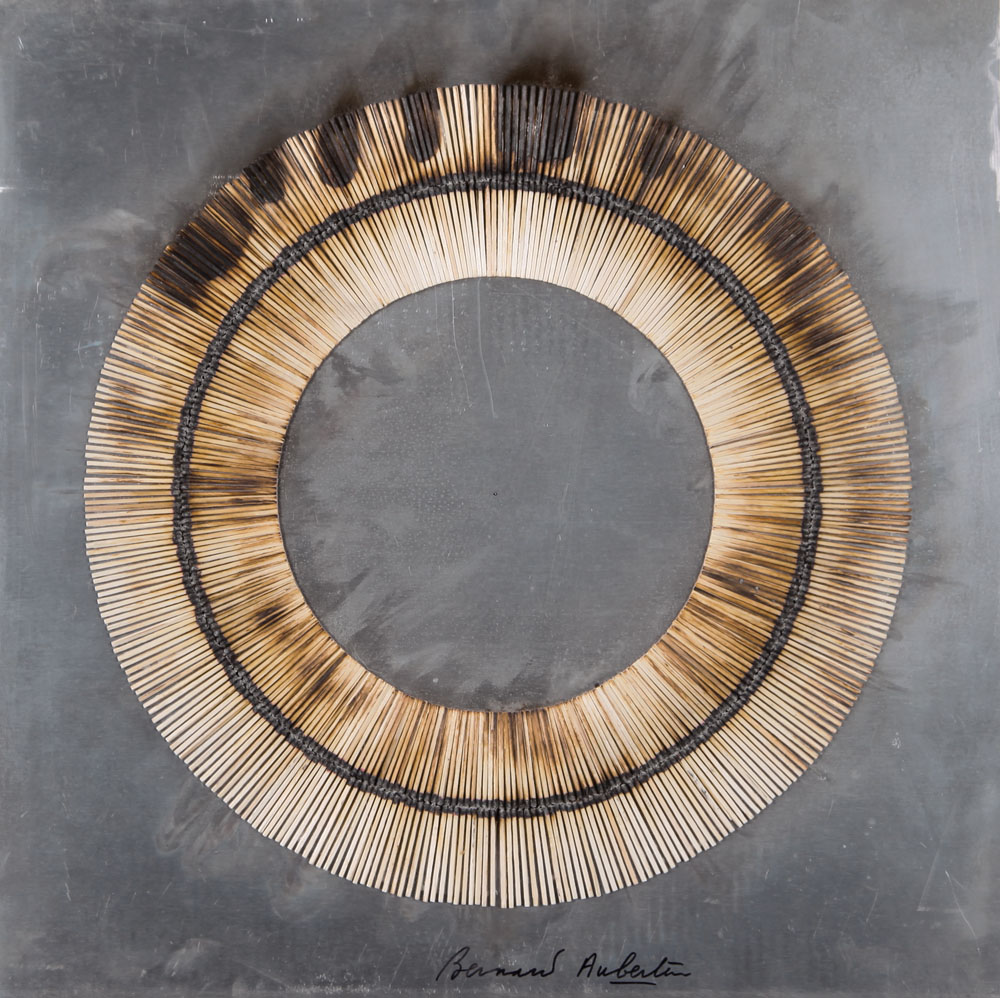 BERNARD AUBERTIN Fontenay aux Roses 1934 Dessin de feu fiammiferi bruciati su alluminio cm. 50x50, firma in basso al centro, dichiarazione d'autenticità dell'artista su foto, pubblicata sul catalogo della mostra "Bernard Aubertin, Fuoco e metallo", tenutasi presso la Galleria Allegrini Arte, pagina 94, entro teca in plexiglass.