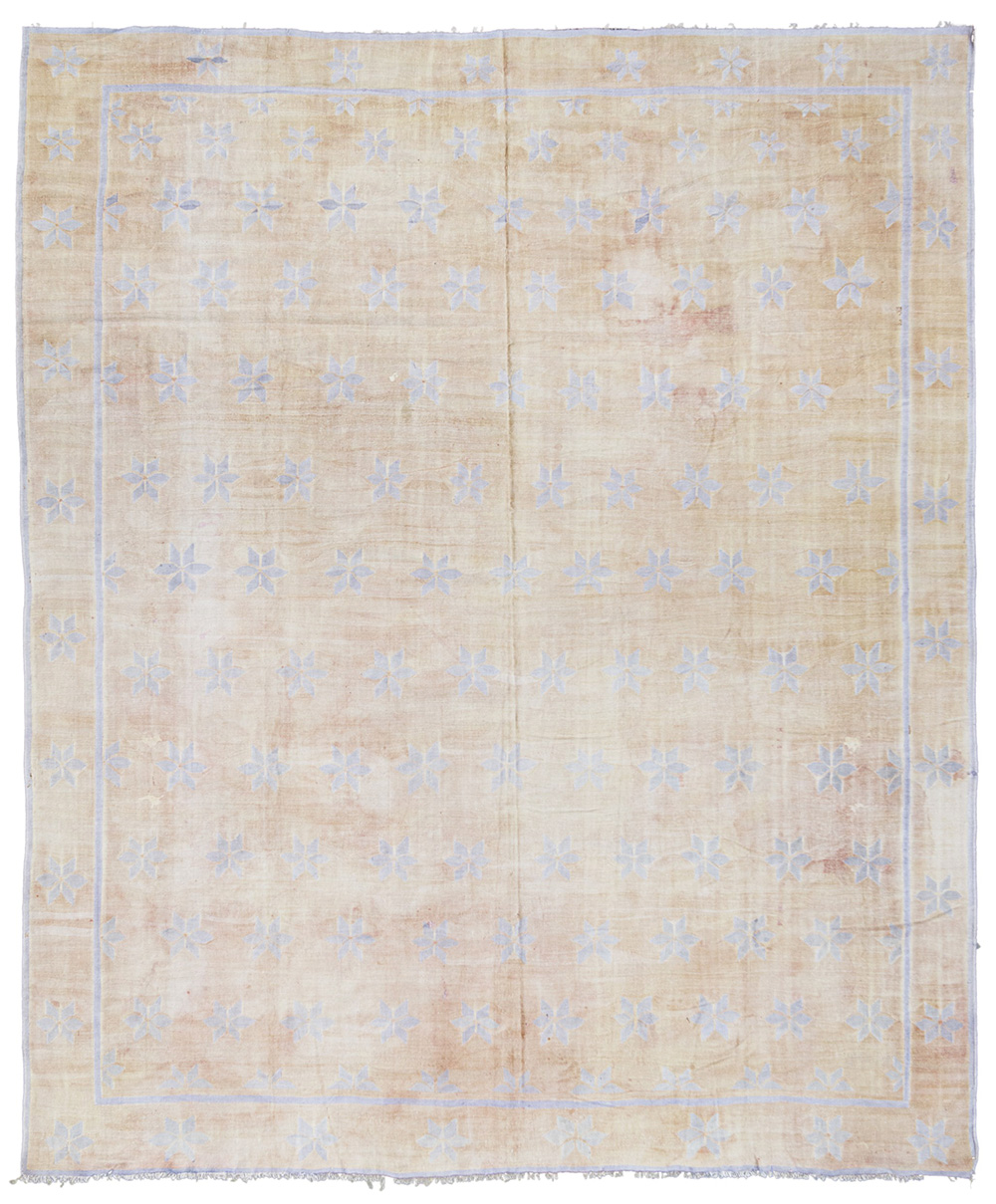 Kilim Durrie tessuto a mano in cotone. Decoro "allover" con stelle azzurro pallido geometricamente ripetute su fondo pesca. (cm 445x380) (difetti)