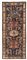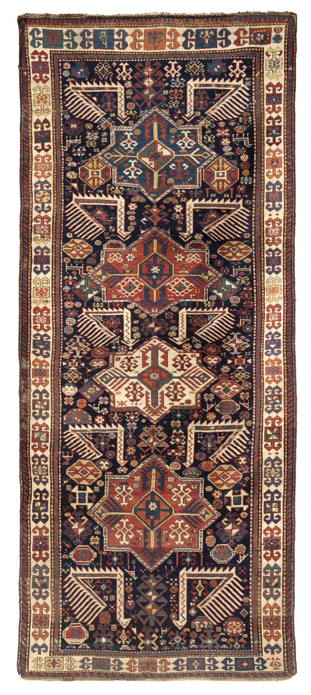 Decorato con quattro medaglioni poliedrici in sequenza a fondo blu, rosso, bianco e rosso. Colore del campo blu notte su cui spiccano cinque coppie di pavoni stilizzati e contrapposti, profilati in bianco. Tipici motivi di questa provenienza. La decorazione è completata da numerosi simbili zoomorfi e fitomorfi silizzati tipici della produzione Caucasica. Bordura principale con cartigli stilizzati policromi su fondo bianco. (cm 298x127) (difetti)